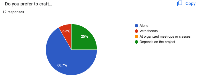Two-thirds of respondents prefer to craft alone, though many said their preference depends on the project. And encouragingly, 83% finish their projects “most of the time.”
