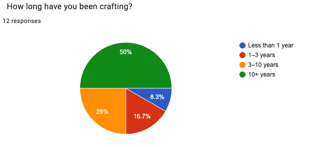 85.7% of respondents said they currently, or have in the past, engaged in a craft hobby. Half of them have been crafting for 10 or more years, suggesting that craft is often a long-term, meaningful part of people’s lives, not a fleeting hobby trend.